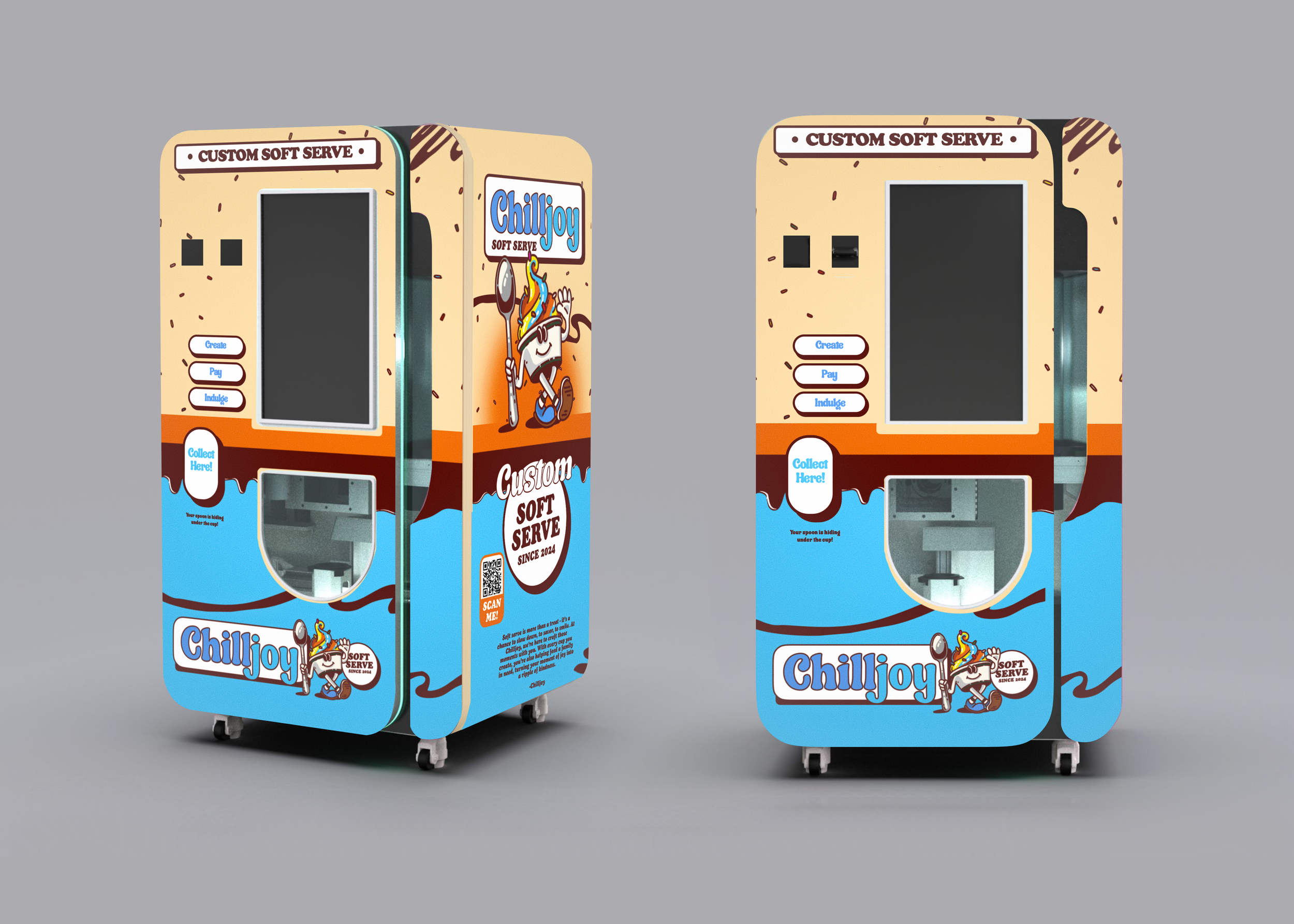 Chilljoy is a robotics-driven soft serve company that merges playful indulgence with precision engineering. Through sleek, automated dispensing systems, the brand delivers consistently perfect swirls in seconds — eliminating friction while elevating the dessert experience through thoughtful industrial and interaction design.