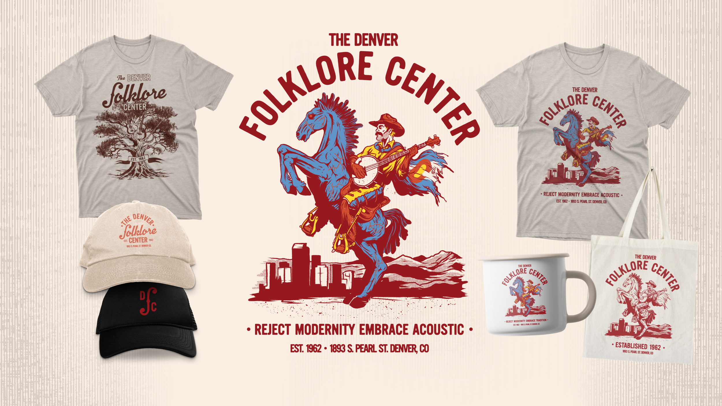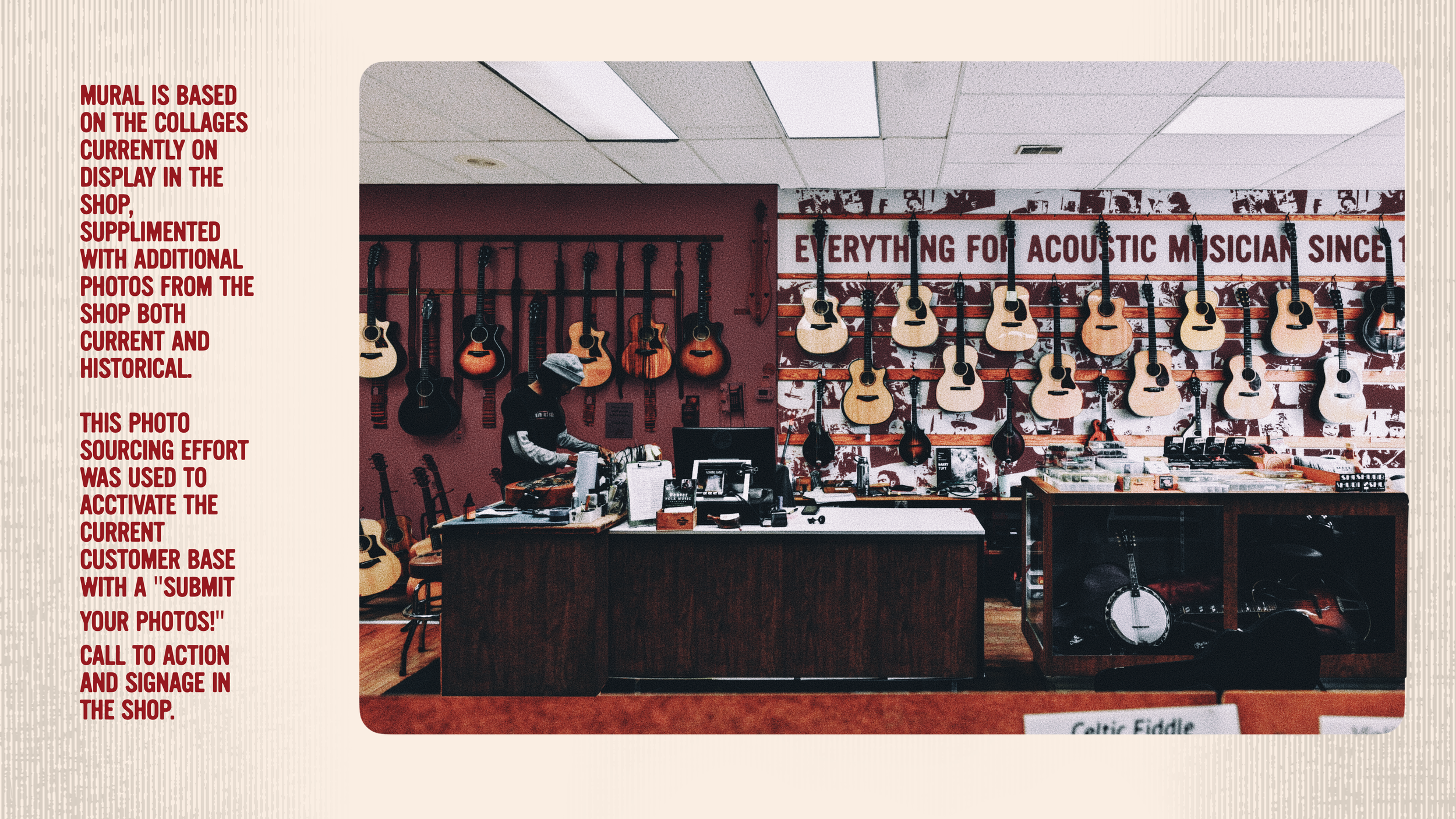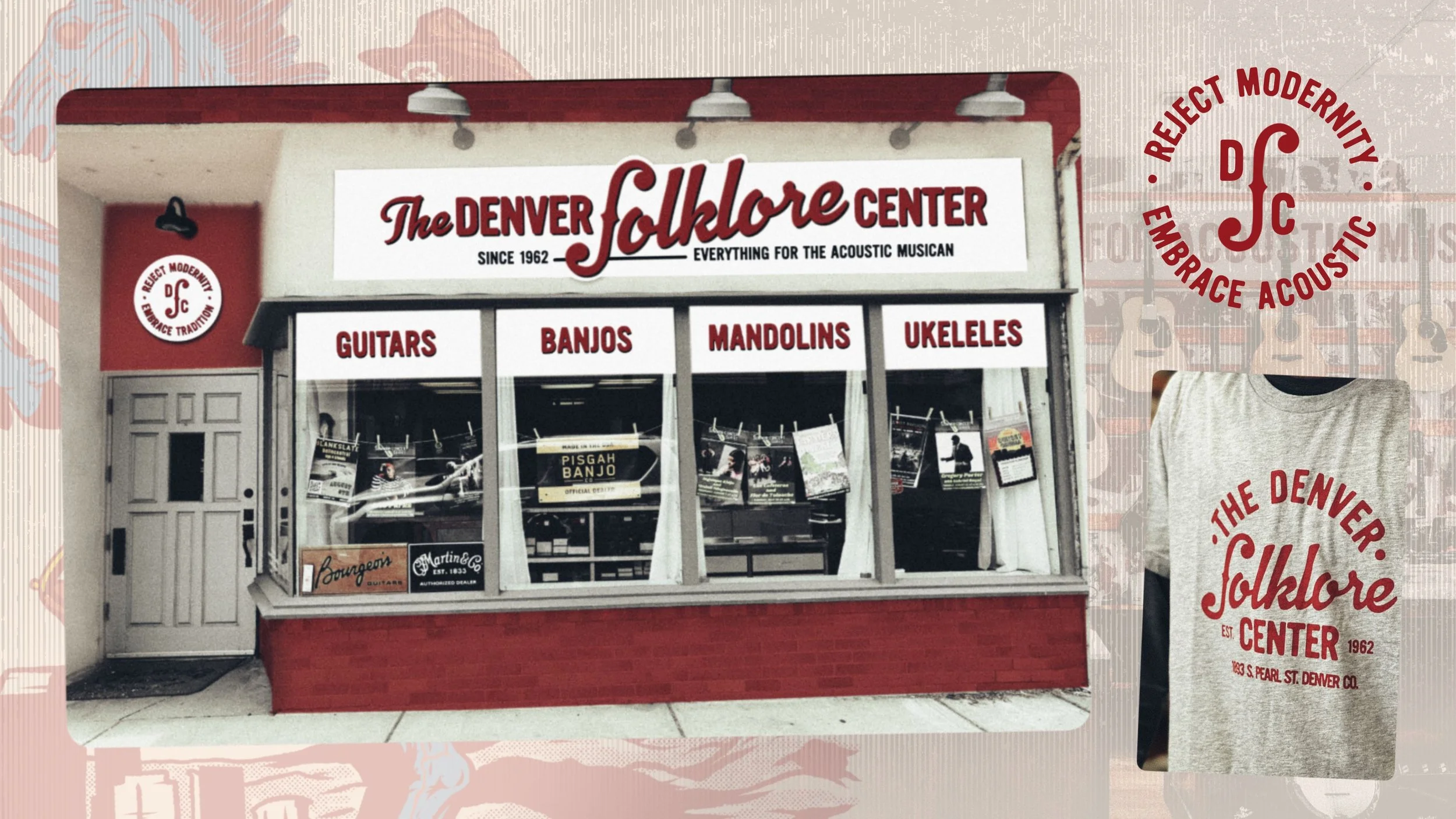 In parallel, I directed a fully branded façade and interior redesign—reimagining environmental graphics, wayfinding, spatial tone, and experiential flow to modernize the retail environment while preserving its authenticity. The result was a future-forward brand ecosystem that positioned the Denver Folklore Center as both a historic institution and a vibrant, relevant hub for the next generation of acoustic musicians.